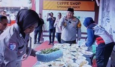 Para petugas, termasuk anggota polisi wanita (Polwan), turun langsung ke dapur lapangan untuk memasak dan menyajikan hidangan hangat bagi para pelintas jalur mudik.
