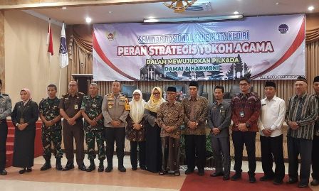 KOTA KEDIRI (Tribratanews.jatim.polri.go.id) – Forum Kerukunan Umat Beragama (FKUB) Kota Kediri menggelar seminar nasional dengan tema “Peran Strategis Tokoh Agama dalam Mewujudkan Pilkada Damai dan Harmoni” berlangsung di Hotel Lotus, Rabu (16/10/2024). Seminar ini bertujuan untuk mengajak masyarakat menjaga persatuan dan kesatuan selama berlangsungnya Pemilihan Kepala Daerah (Pilkada) 2024.
